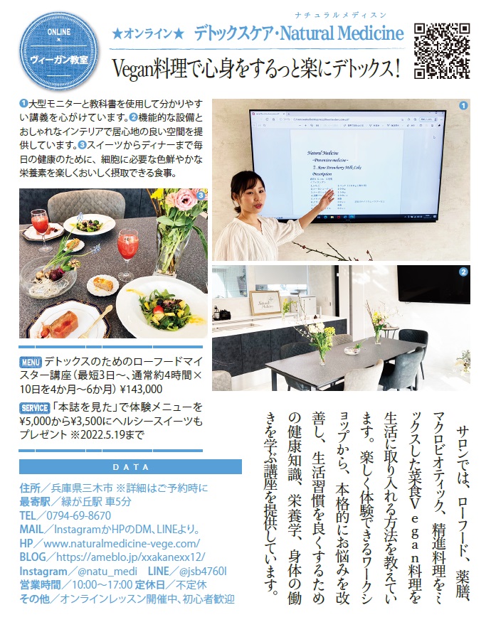 デトックスについて学び実践した後、加熱した菜食料理やマクロビオティック、精進料理、薬膳、メディカルアロマの考えを融合させた菜食で身心を整えていく方法を学びます。
